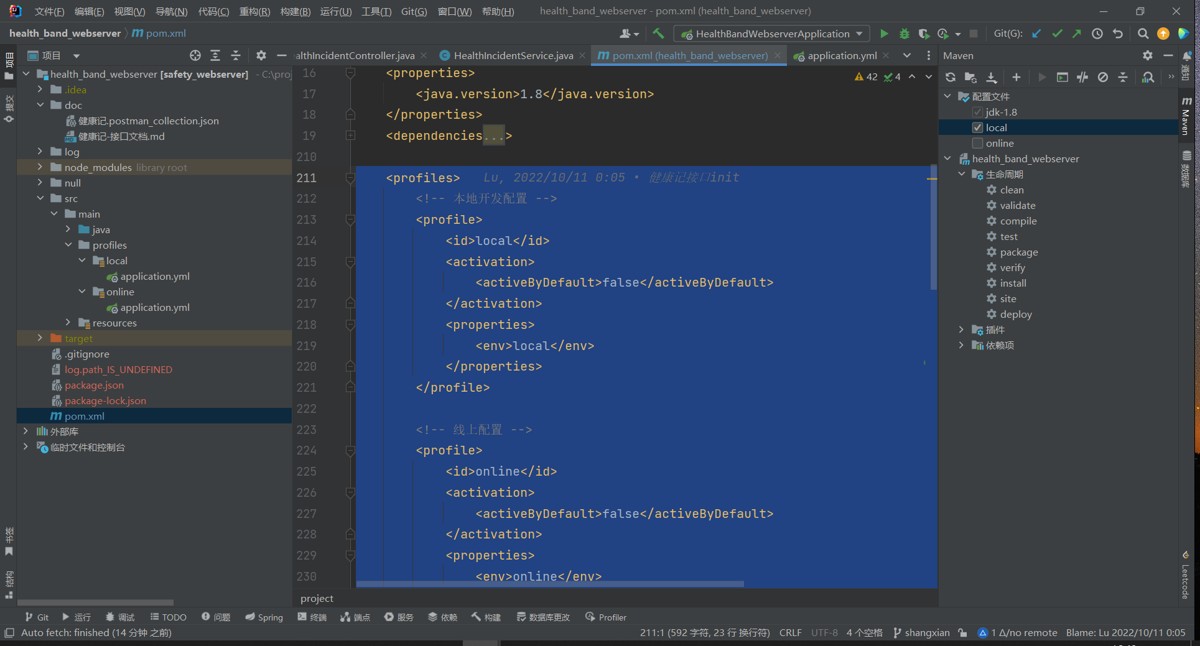 <profiles> <!-- 本地开发配置 --> <profile> <id>local</id> <activation> <activeByDefault>false</activeByDefault> </activation> <properties> <env>local</env> </properties> </profile> <!-- 线上配置 --> <profile> <id>online</id> <activation> <activeByDefault>false</activeByDefault> </activation> <properties> <env>online</env> </properties> </profile> </profiles>