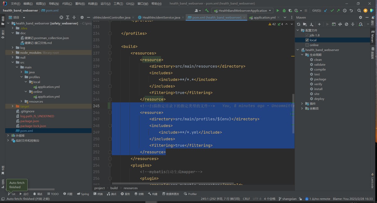 <!--扫描指定目录下的指定类型的文件--> <resource> <directory>src/main/profiles/${env}</directory> <includes> <include>**/*.yml</include> </includes> <filtering>true</filtering> </resource>