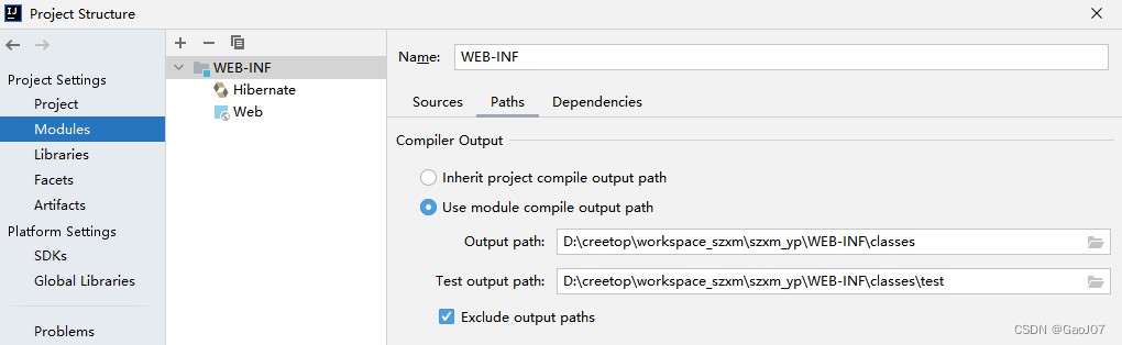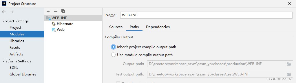 2.2【Paths】部分,【compiler output】是编译java代码的class文件,选择【Use module compile output path】,选择编译的.class文件存放的位置