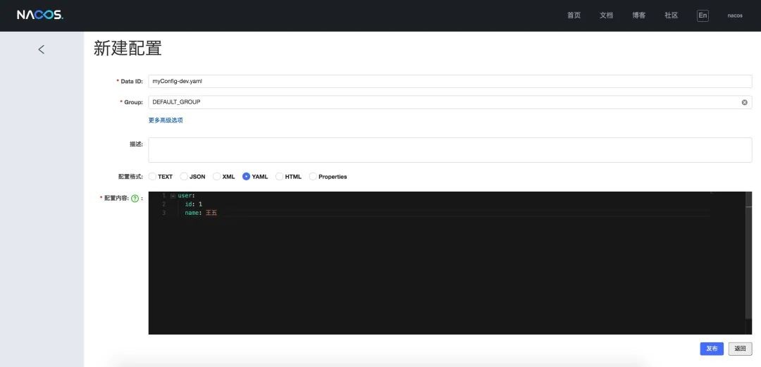 properties或yaml。 - 配置内容:输入具体的配置信息,例如在