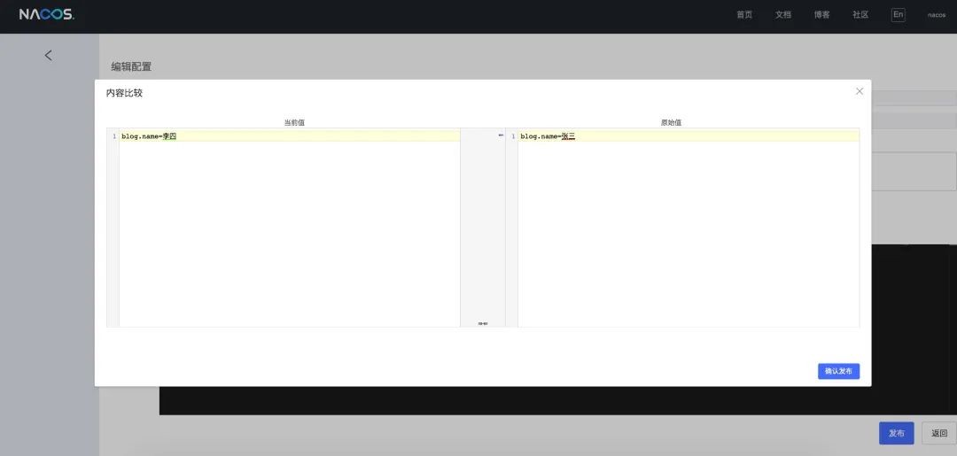 下面我们在 Nacos 中将blog.name配置内容稍微修改一下,验证一下客户端的配置变量是否能动态刷新。