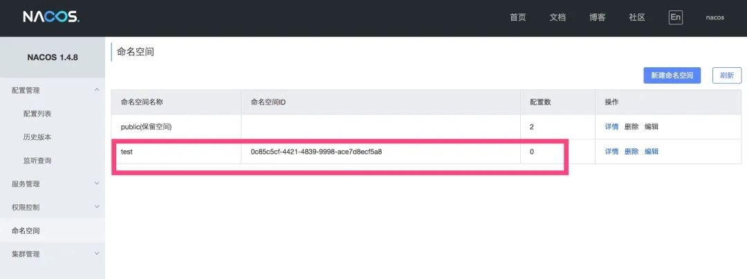 Namespace 隔离实现主要通过命名空间来完成,在 Nacos 服务管理平台的命令空间下创建。