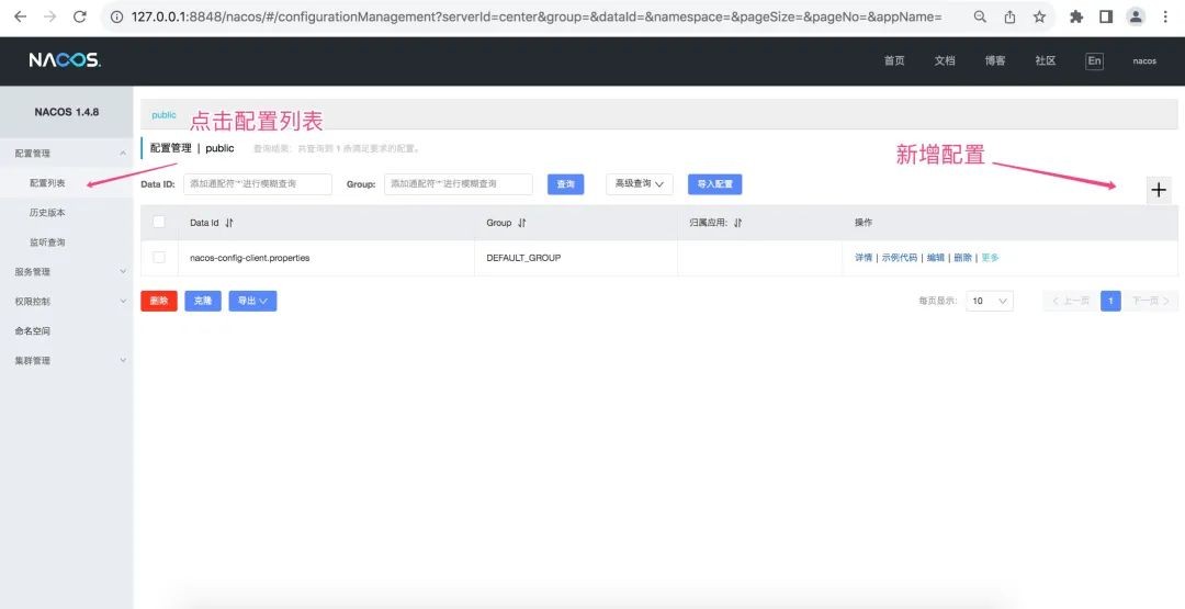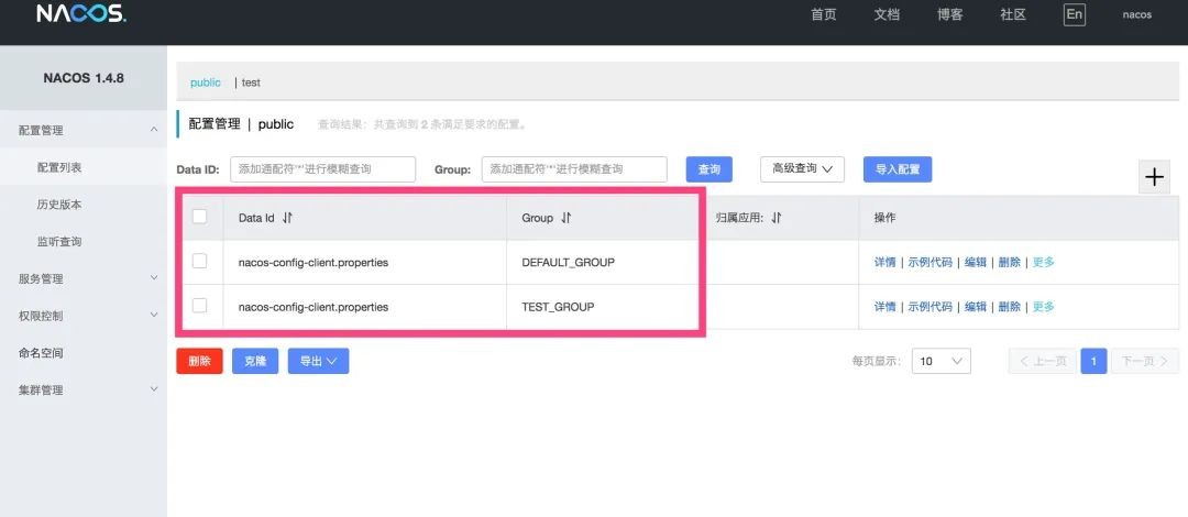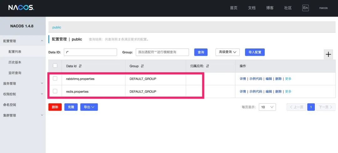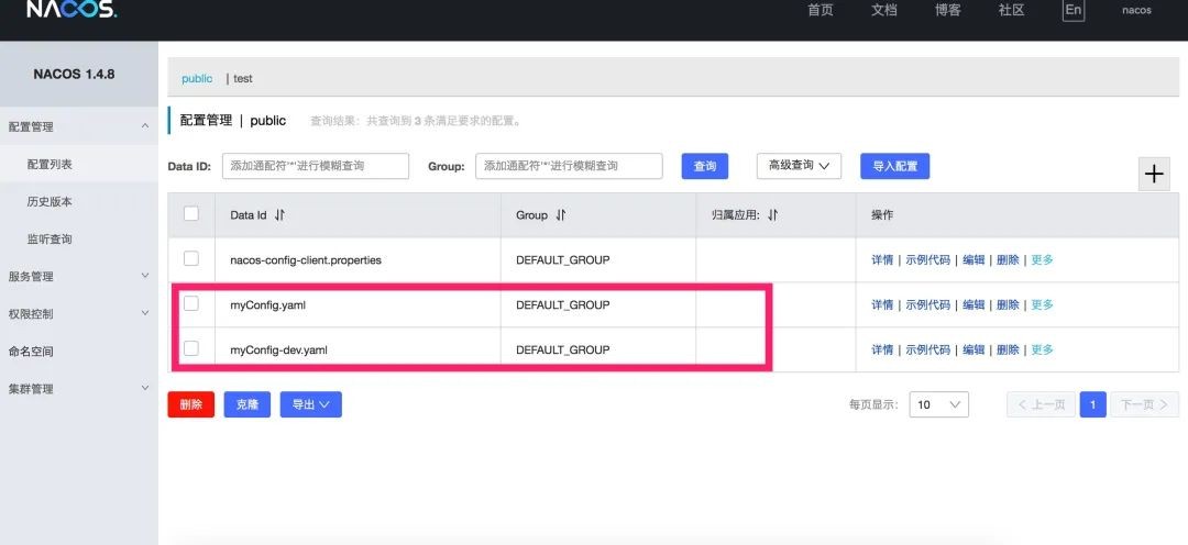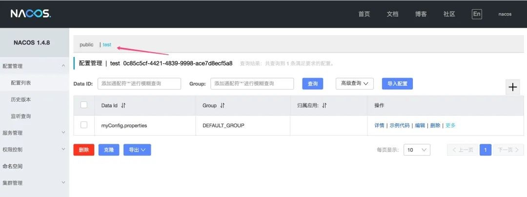 创建完成之后,在配置列表的最上方可以看到除了 public 之外,多了一个刚才创建的 Namepsace。