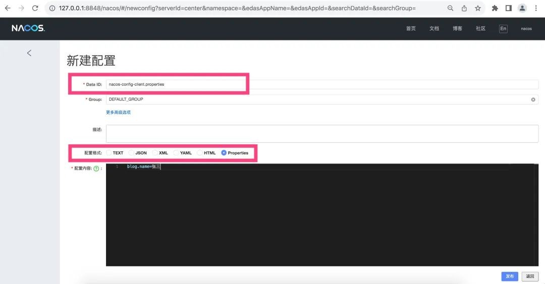 为了便于演示,在上文中我们创建了一个 dataId 为nacos-config-client.properties,Group 为DEFAULT_GROUP,内容为blog.name=张三的配置信息。