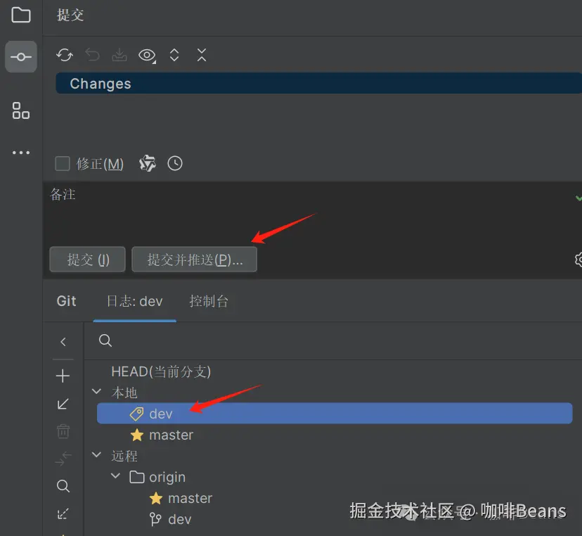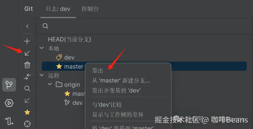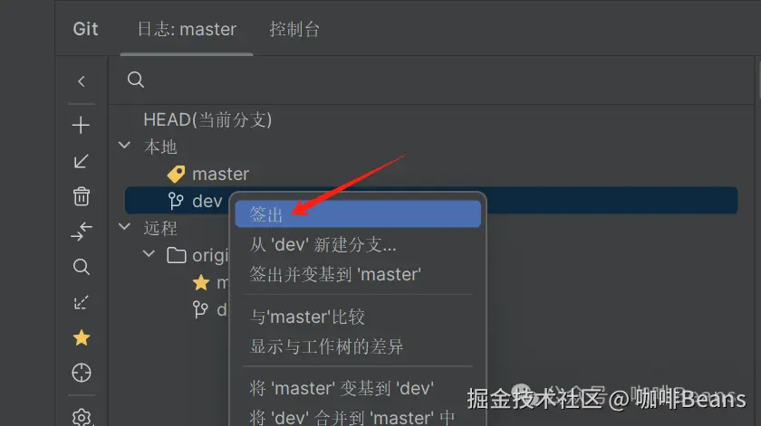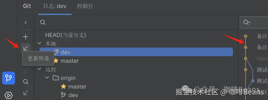 右键dev选择合并到 master(需先切换到 master 分支),解决冲突,推送合并后的 master
