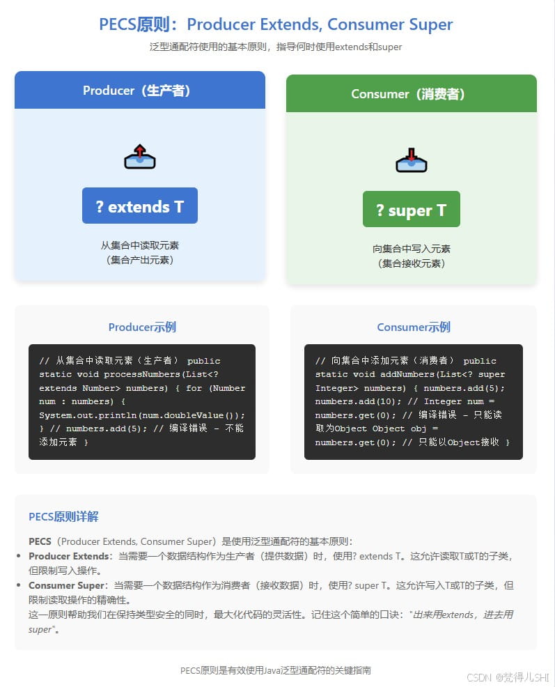 记住 PECS 原则:“Producer Extends, Consumer Super”,遇到泛型集合操作时,先判断是 “读” 还是 “写”,再选择对应的通配符。