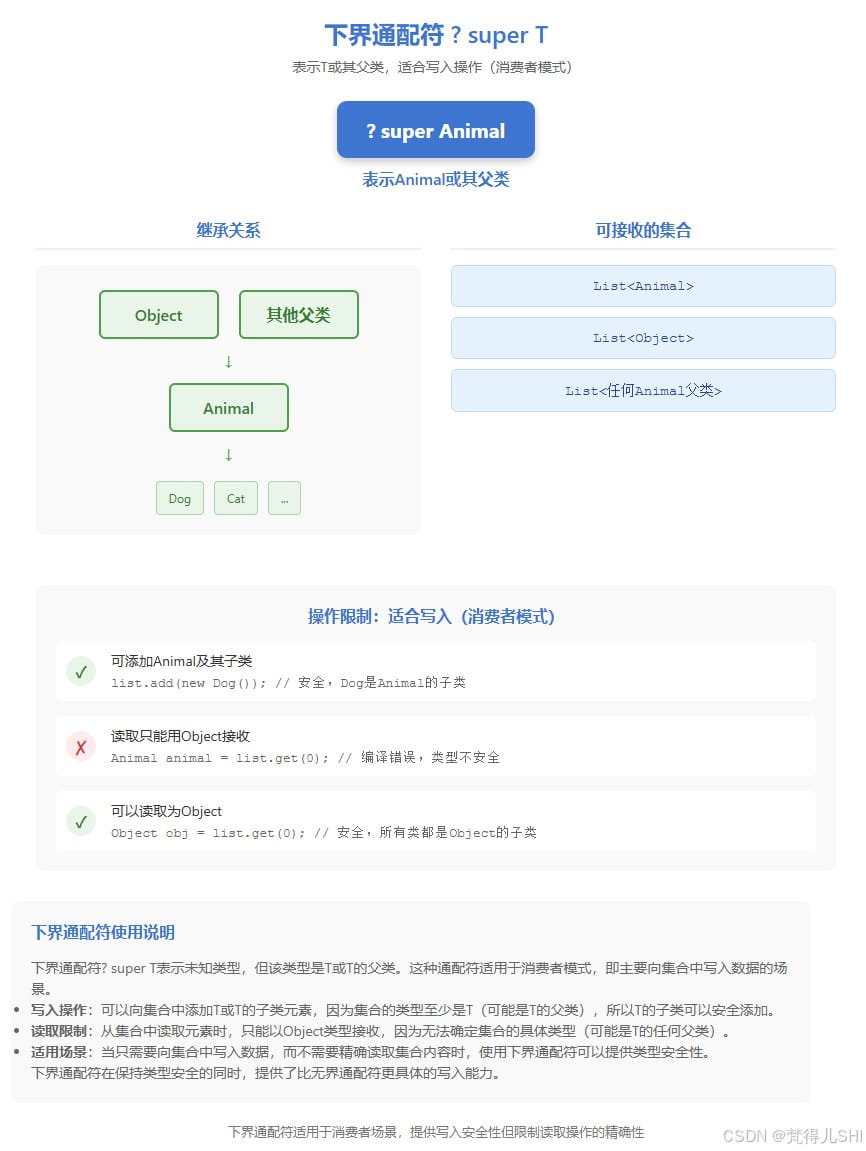 List<? super Animal> animals = new ArrayList<Object>(); animals.add(new Dog()); // 合法 Object obj = animals.get(0); // 只能用Object接收 // Animal animal = animals.get(0); // 编译报错:可能是List<Object>,不能确定是Animal