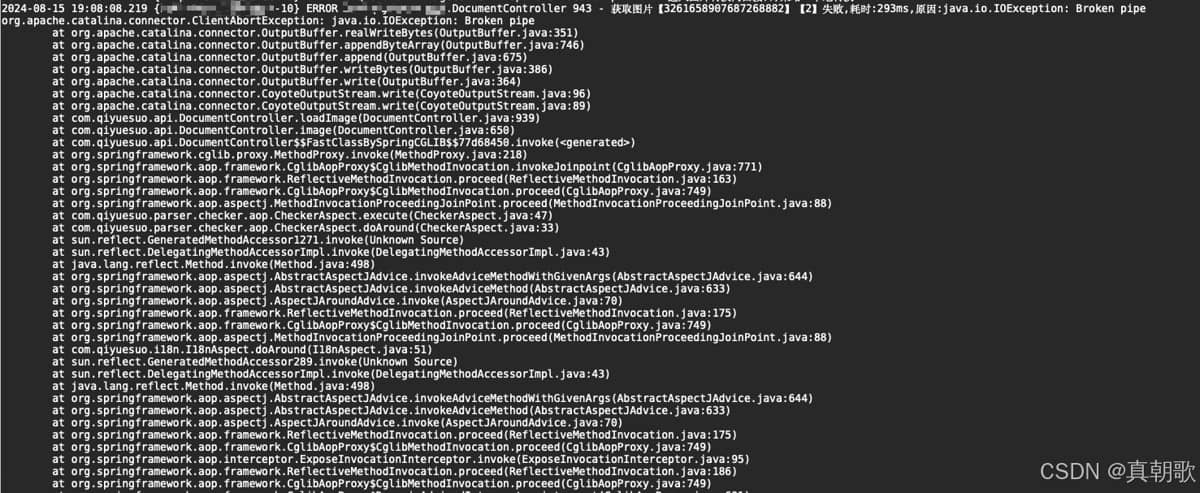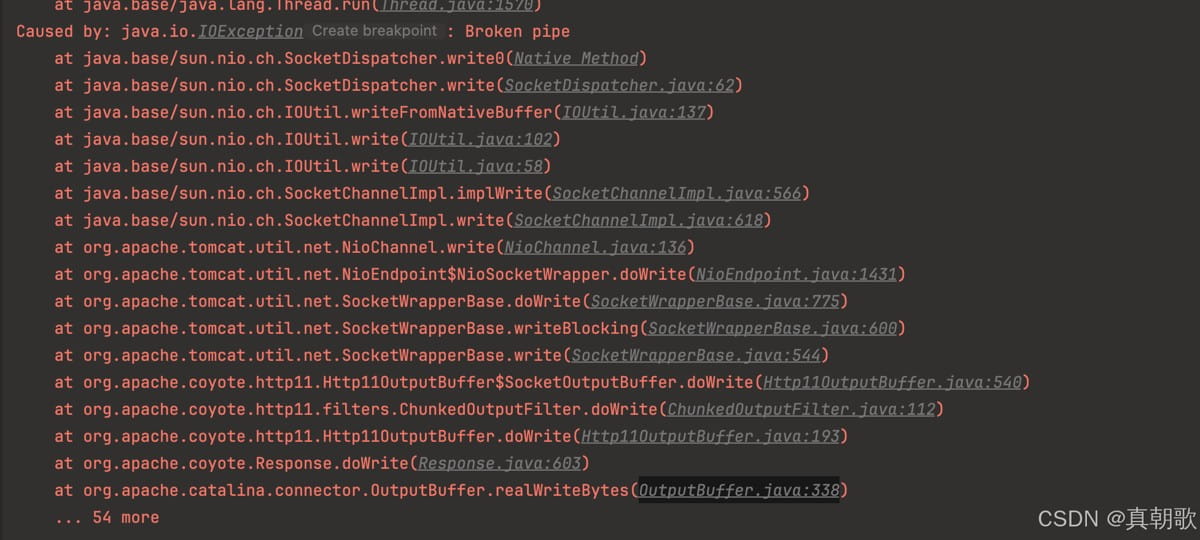 排查问题发生时间的日志发现抛出了一个io异常 java.io.IOException: Broken pipe 断开的管道