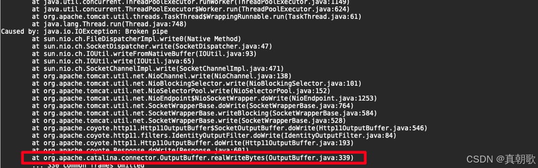 观察最底部的堆栈信息发现异常是在 OutputBuffer 类的 realWriteBytes 方法中抛出的。