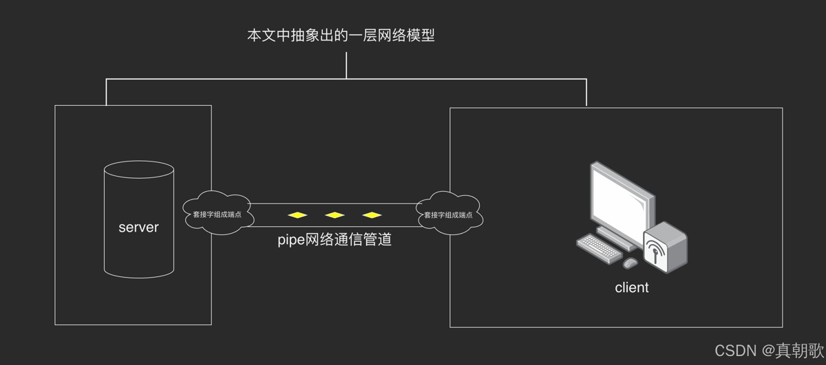 现在本文中我们讨论的网络通信的上下文的术语“pipe”并不是指进程间通信的物理管道,而是指客户端和服务器之间的通过网络套接字建立的数据传输路径。在实际的网络通信中,客户端与服务器之间通过套接字建立连接,这个连接就是通信的“管道”。数据通过这个“管道”进行传输。可以将它看作是一条“虚拟通道”,通过这个通道,客户端和服务器之间可以进行双向数据传输。