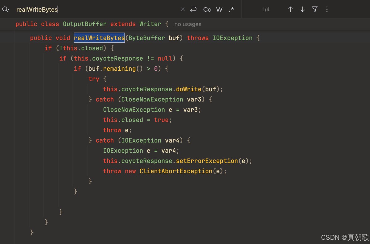 首先我们要清楚realWriteBytes 方法是 Tomcat 中 OutputBuffer 类的一部分,它用于将数据从缓冲区写入到目标输出流(通常是网络套接字)。这个方法是 OutputBuffer 类的核心方法之一,用于处理数据写入的底层细节。