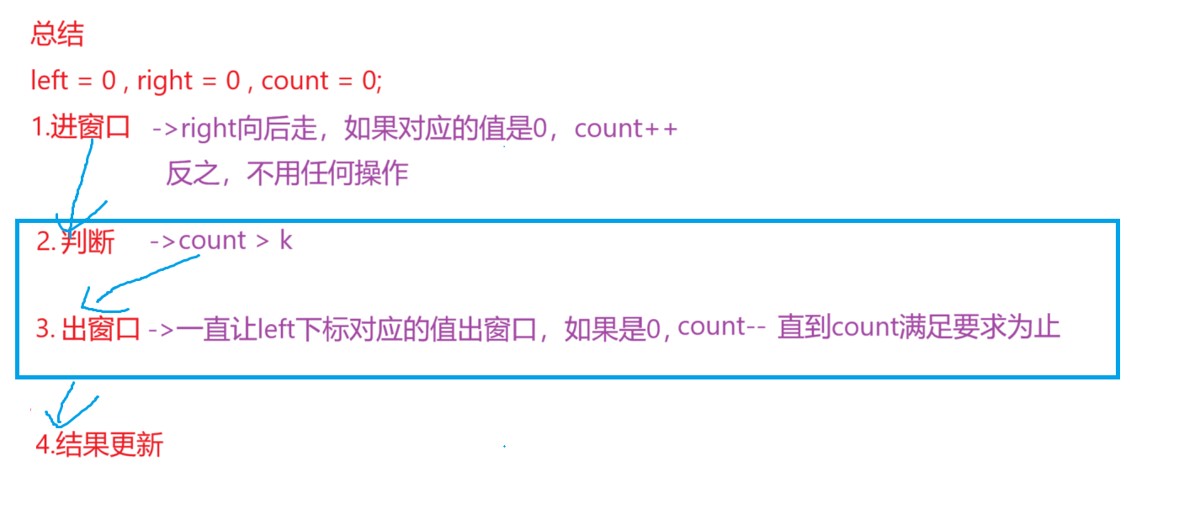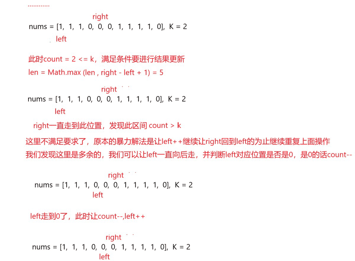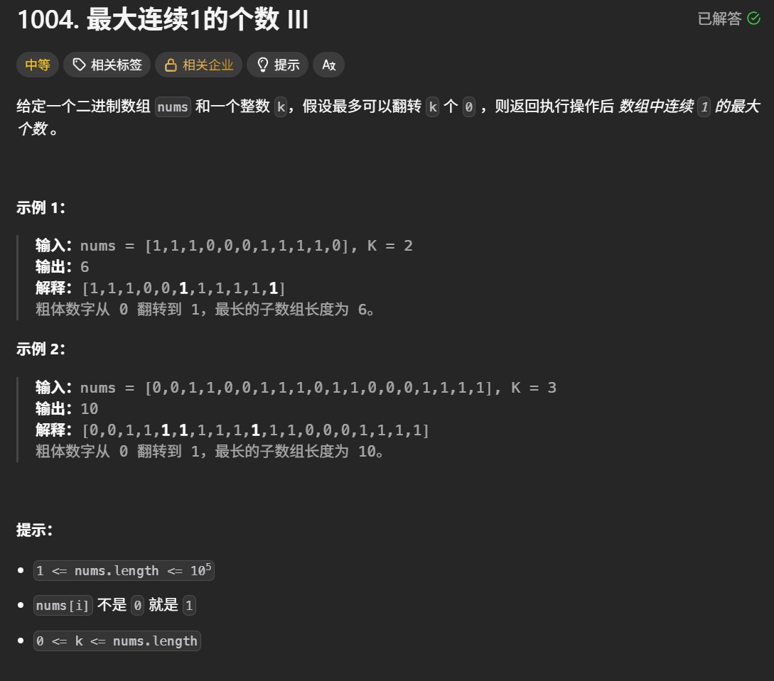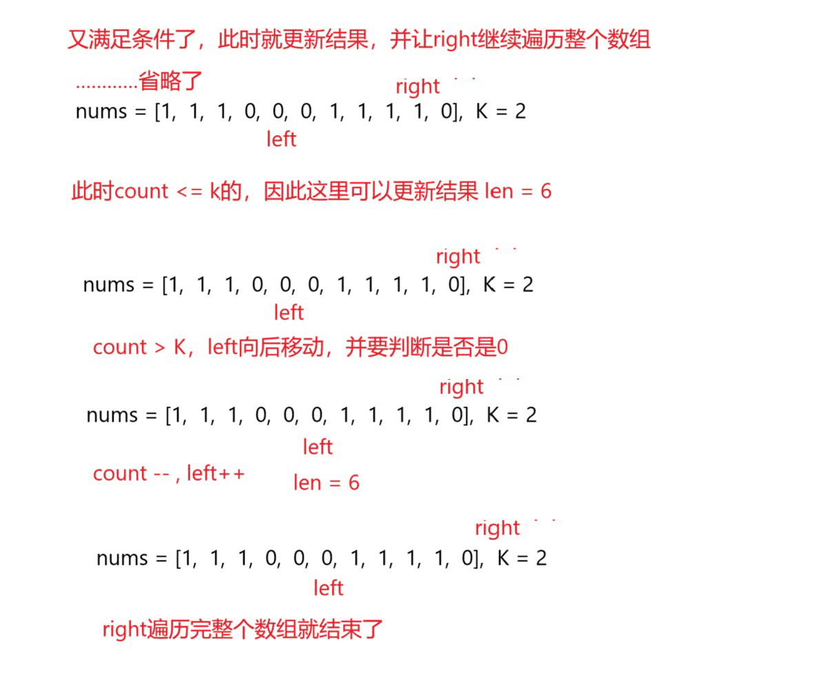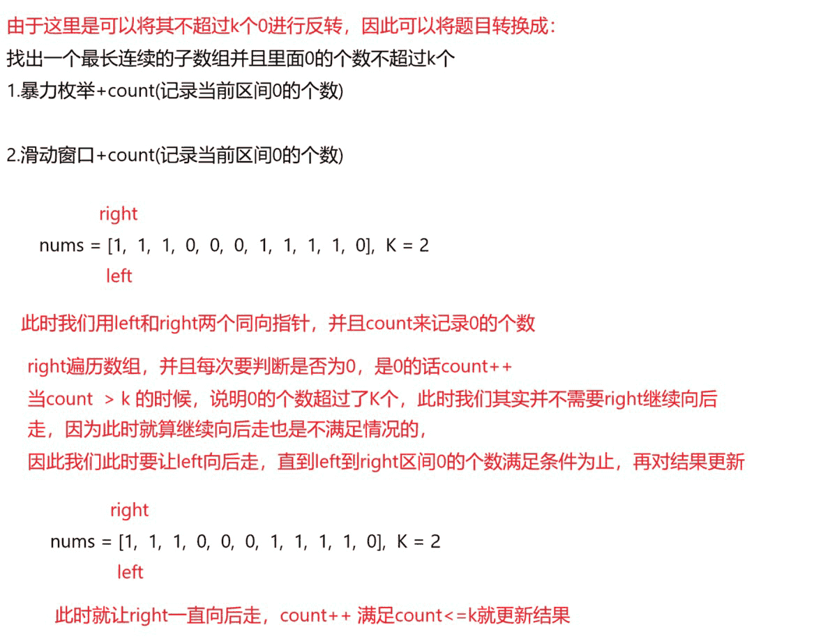 因此我们可以将其题目转换成找出一个最长子数组并且里面0的个数步超过k个