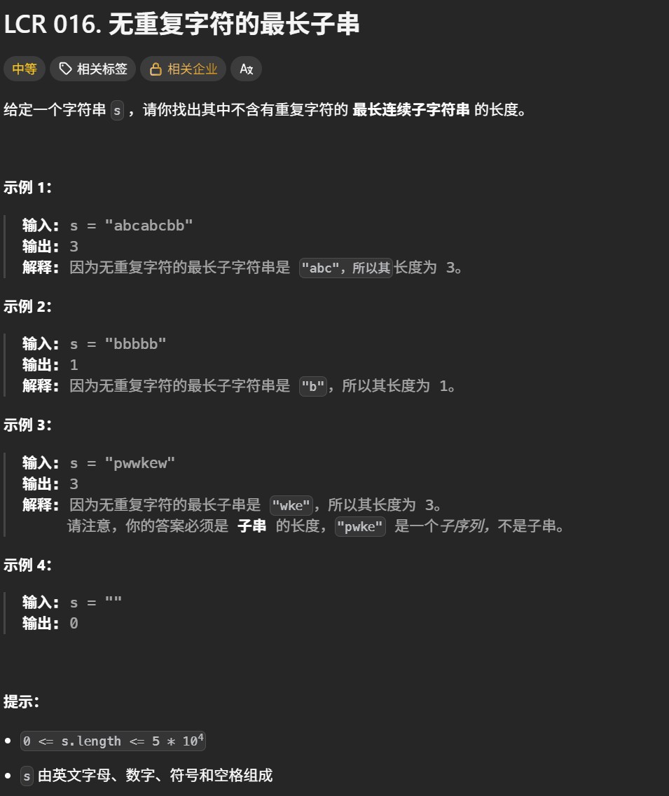 题目解析:这里就是给了我们一个字符串s,让我们在里面找出最长连续不重复的子串长度,如果是空字符串就返回0