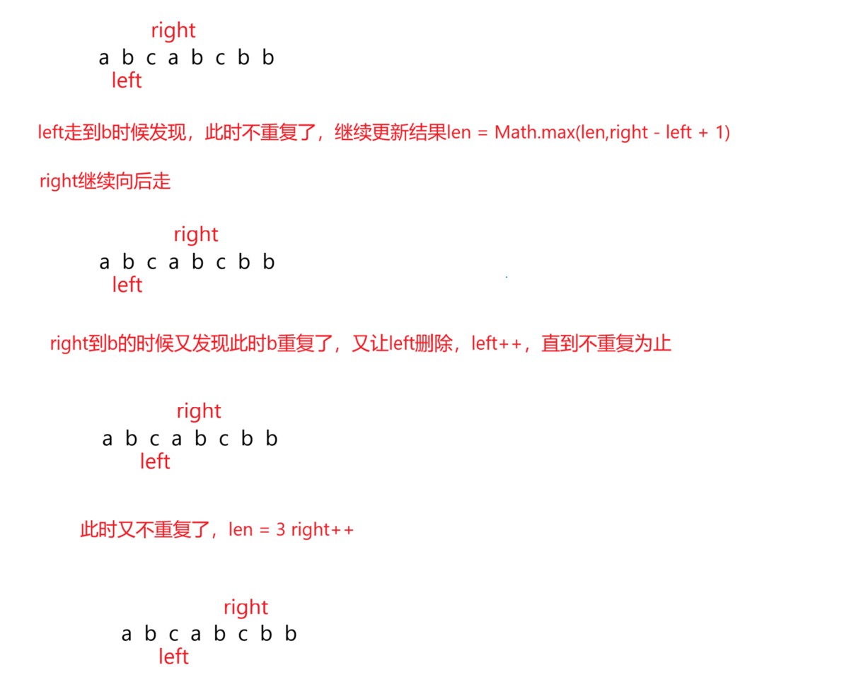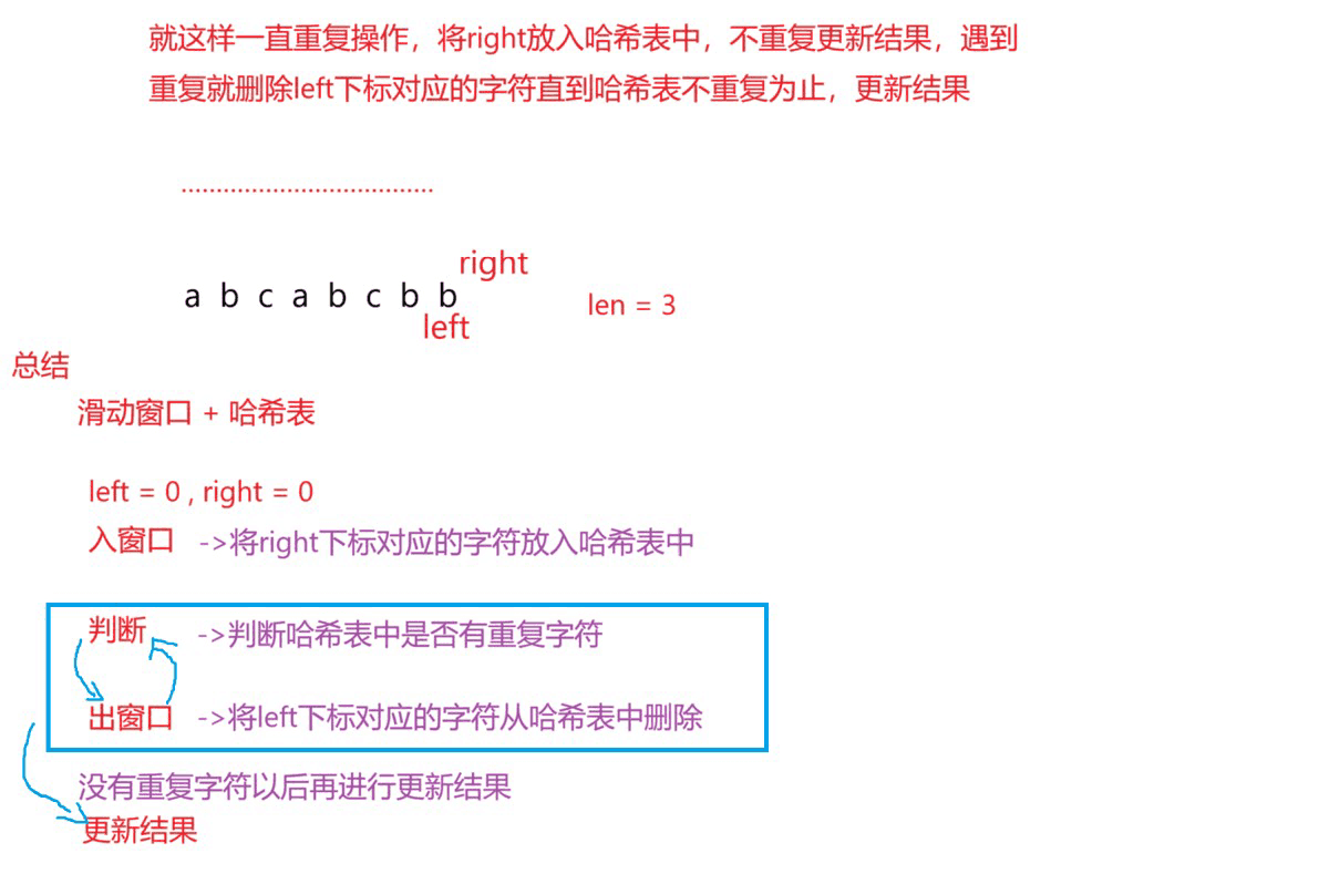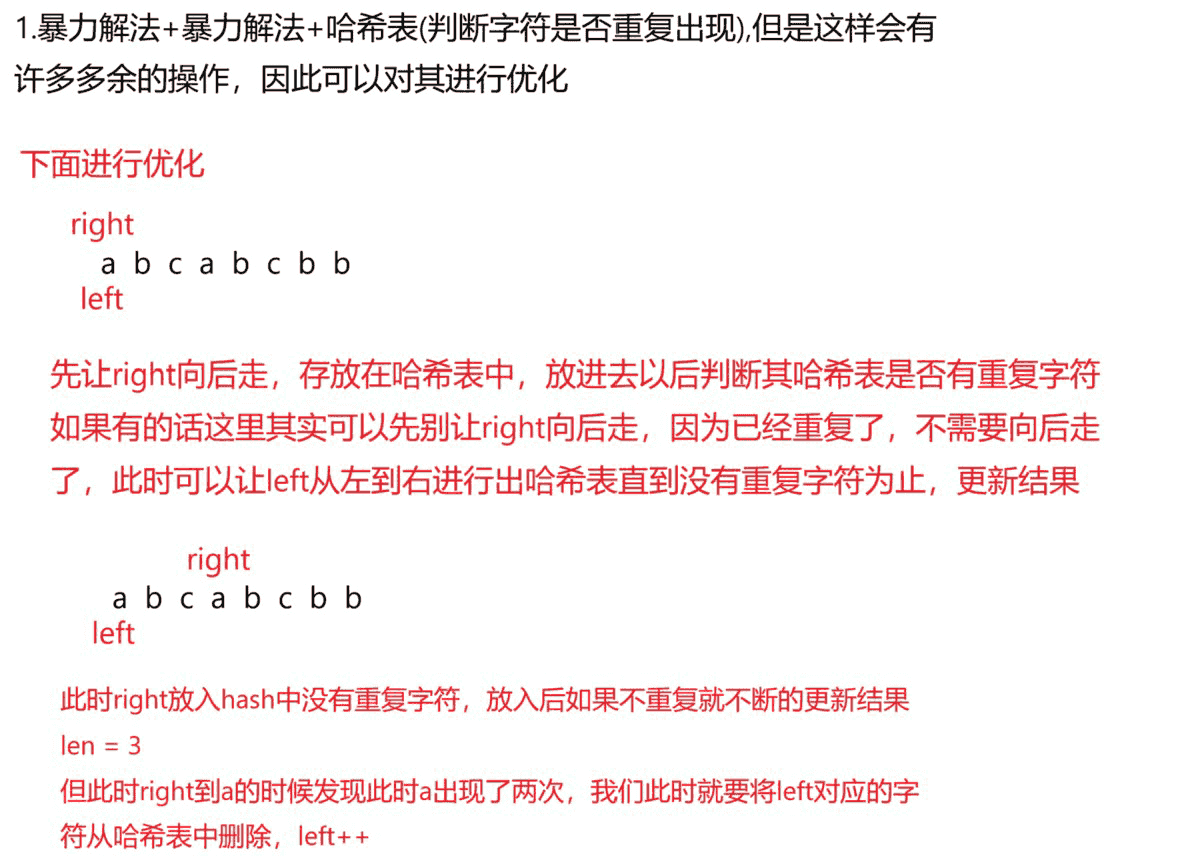 2.滑动窗口+哈希表,上面的暴力解法中会出现一些多余的操作,这里我们用left和right这两个同向双指针,不回退,right用来遍历整个字符串并将其放入哈希表中,并当right下标的字符存放后发现其如果没重复就更新结果 ,如果存在重复,那肯定是此下标有重复的,这时候就将left对应的字符从哈希表中删除,但我们可能要删除很多次,因为我们并不知道其那个是重复的,所以此时是个循环,直到没有重复为止继续更新结果,就这样一直right放入窗口,判断是否有重复字符,有的话就一直出left到没有重复字符为止,更新结果,就这样一直到right遍历完整个字符串