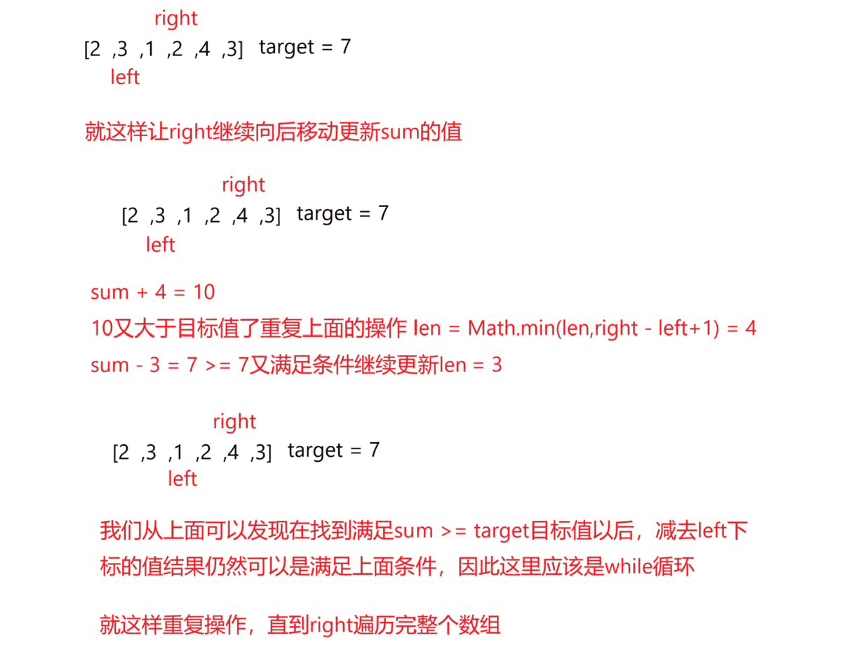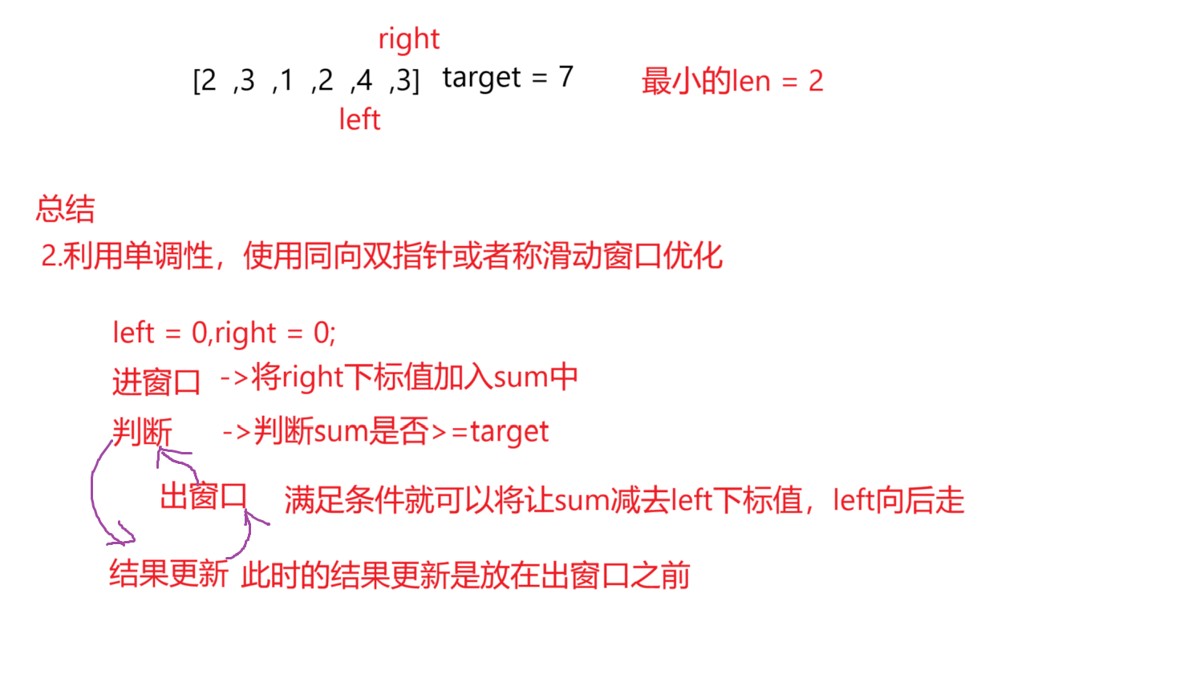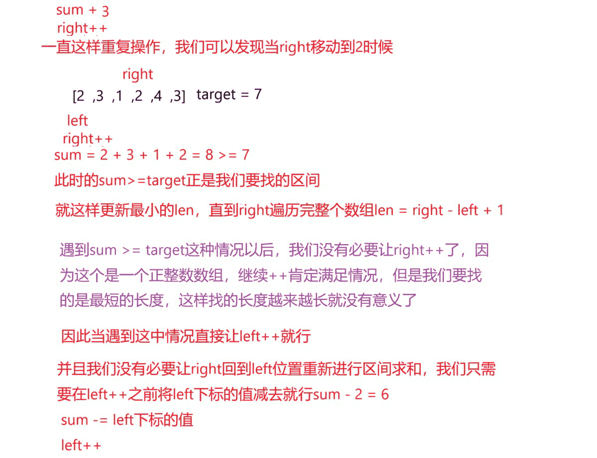 2."同向双指针"也叫滑动窗口算法,这里我们可以使用left和right两个指针向同一个方向移动,并且不回退,此时的思想就和上面暴力解法优化思想一样,一直进行将right下标对应的值放入sum变量中,当sum>=target时候就可以将minlen更新了,此时不必将right向后移动了,只需要将left下标的值减去,让left向后移动,这样重复操作进行查找,直到right遍历完整个数组就完成了