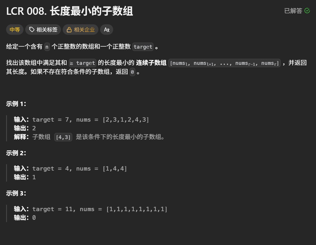 题目解析:这里给我们一个全是正整数的数组和一个目标值,让我们找一段连续的区间,这个区间的值之和是大于等于目标值的,从这个数组中找到一个最小的区间长度,如果不存在的话就返回0