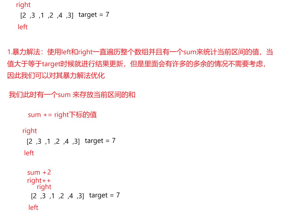算法原理:1.首先我们是可以使用暴力解法,双重for循环进行遍历出所有的情况,当满足区间的值大于等于目标值的话就进行结果更新,反之继续向后操作,我们可以发现这里是有许多的是多余的,就像如果此时的这个区间的值已经大于这个目标值了,如果继续向后操作的话,这个数组是正整数数组,肯定还是大于等于目标值,但是长度变长了,我们要找到是最短的,因此我们可以不需要让其重复操作,直接开始下一次循环就行