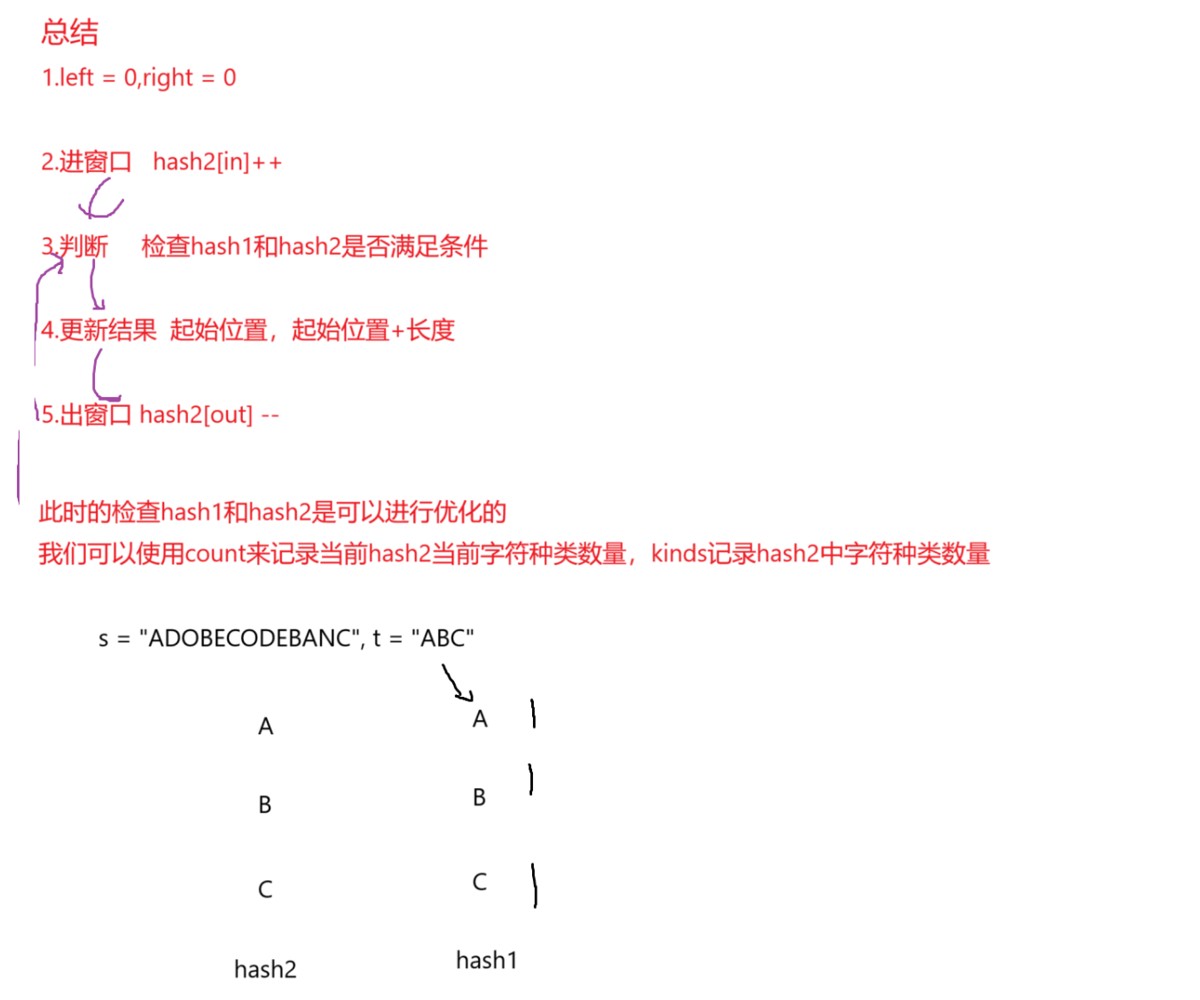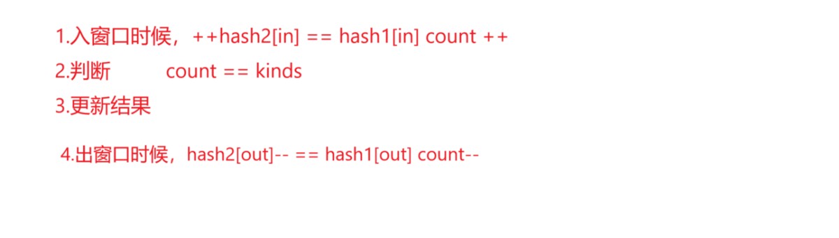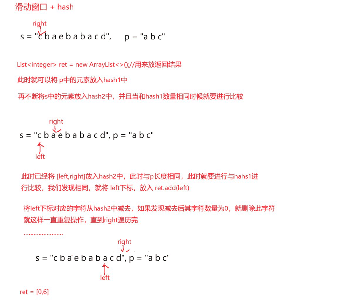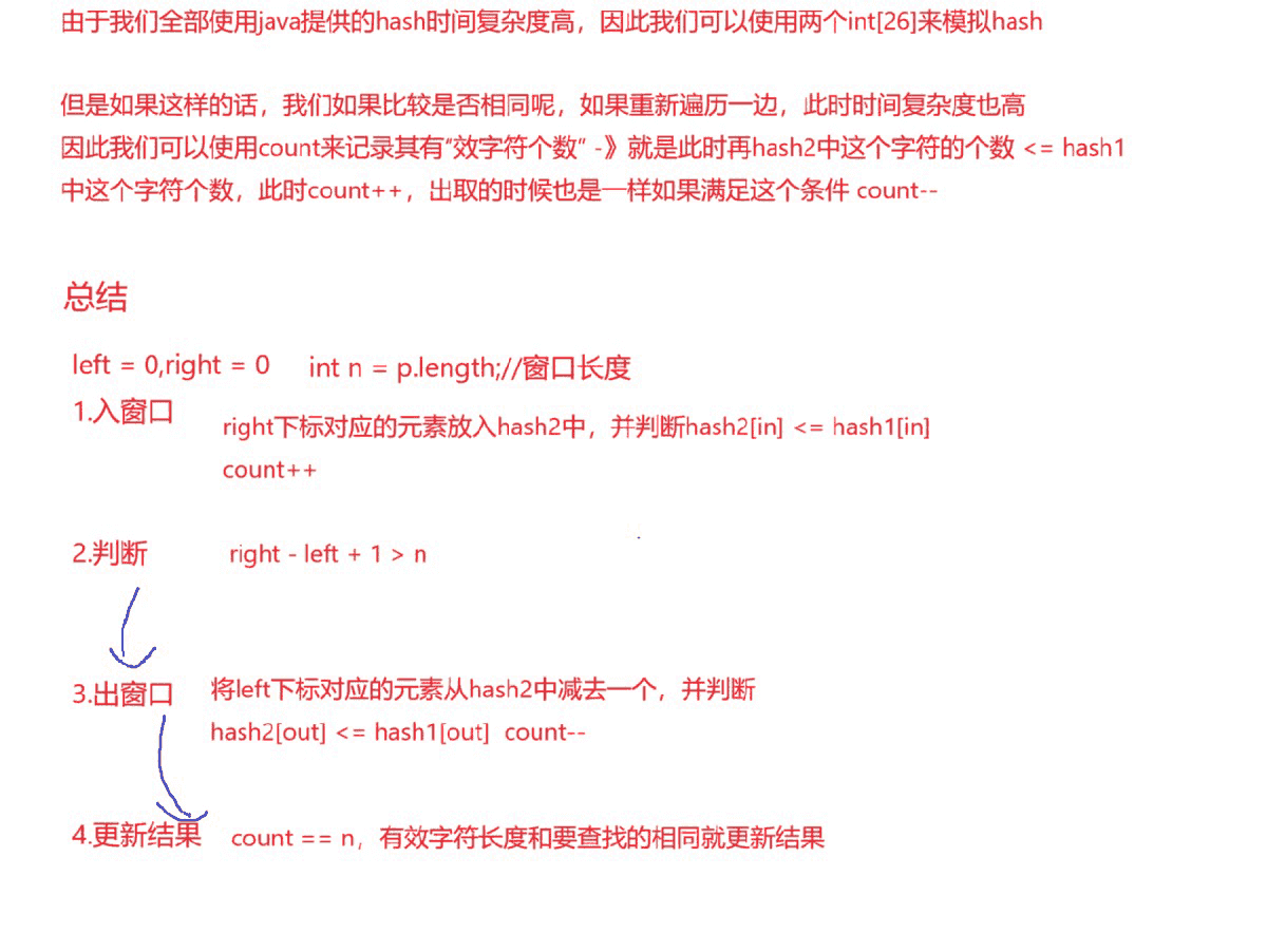 使用left和right来确定窗口,并且此时的窗口长度是一定的,不断让right向后走,left也想后走,right并不需要回头,因为我们要进入下一个窗口仅需将left下标对应的字符出hash,将right+1下标入hash就行,此时就进入下一个窗口,让后进行判断是否相同就行