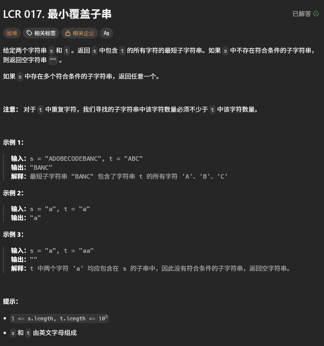 题目解析:在s这个字符串中找到一个最下子串,并且其中每个字母数量要不小于t中的