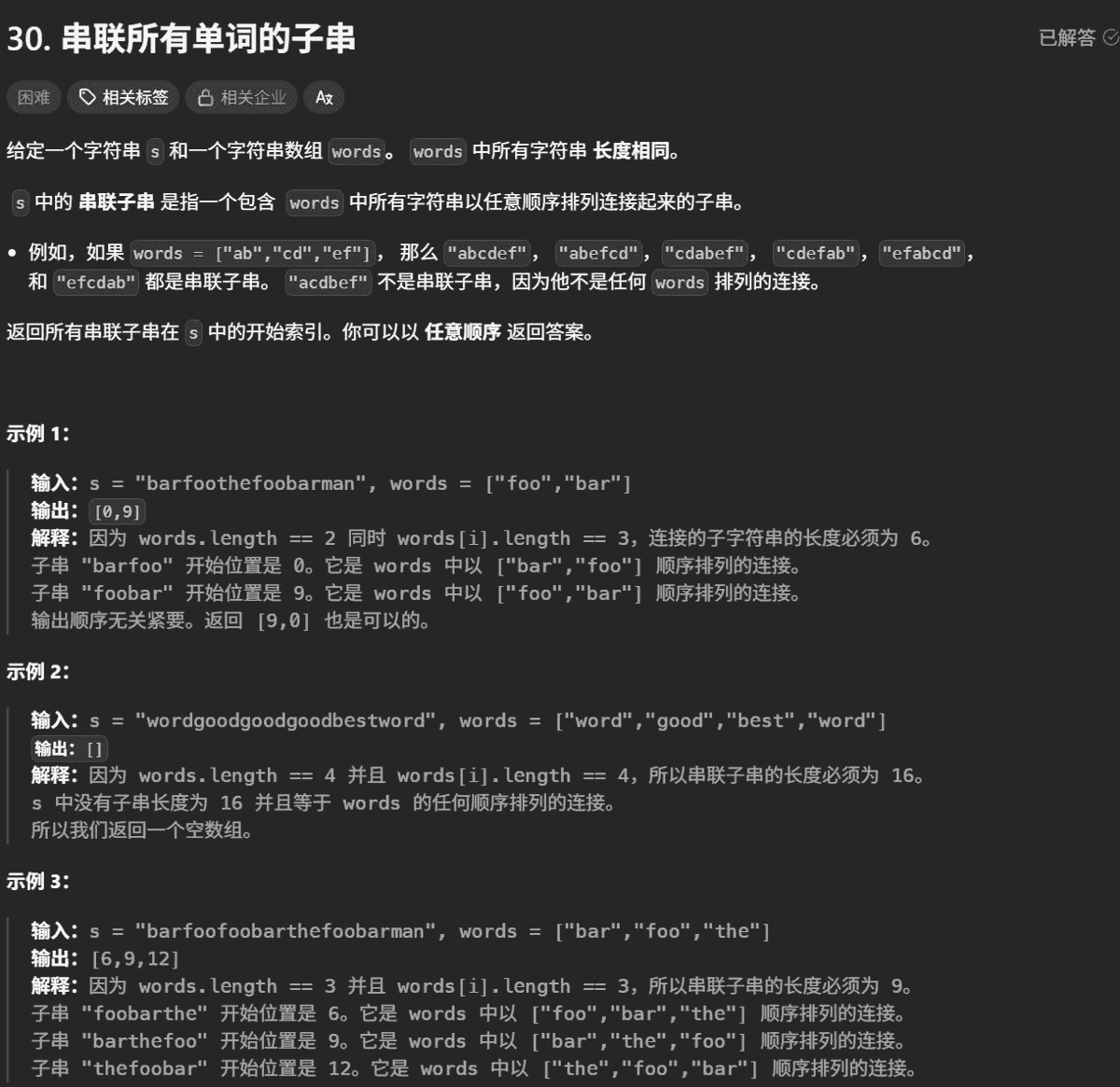 题目解析:就是在一个s字符串中找出包含words中所有单词,并返回所有下标,