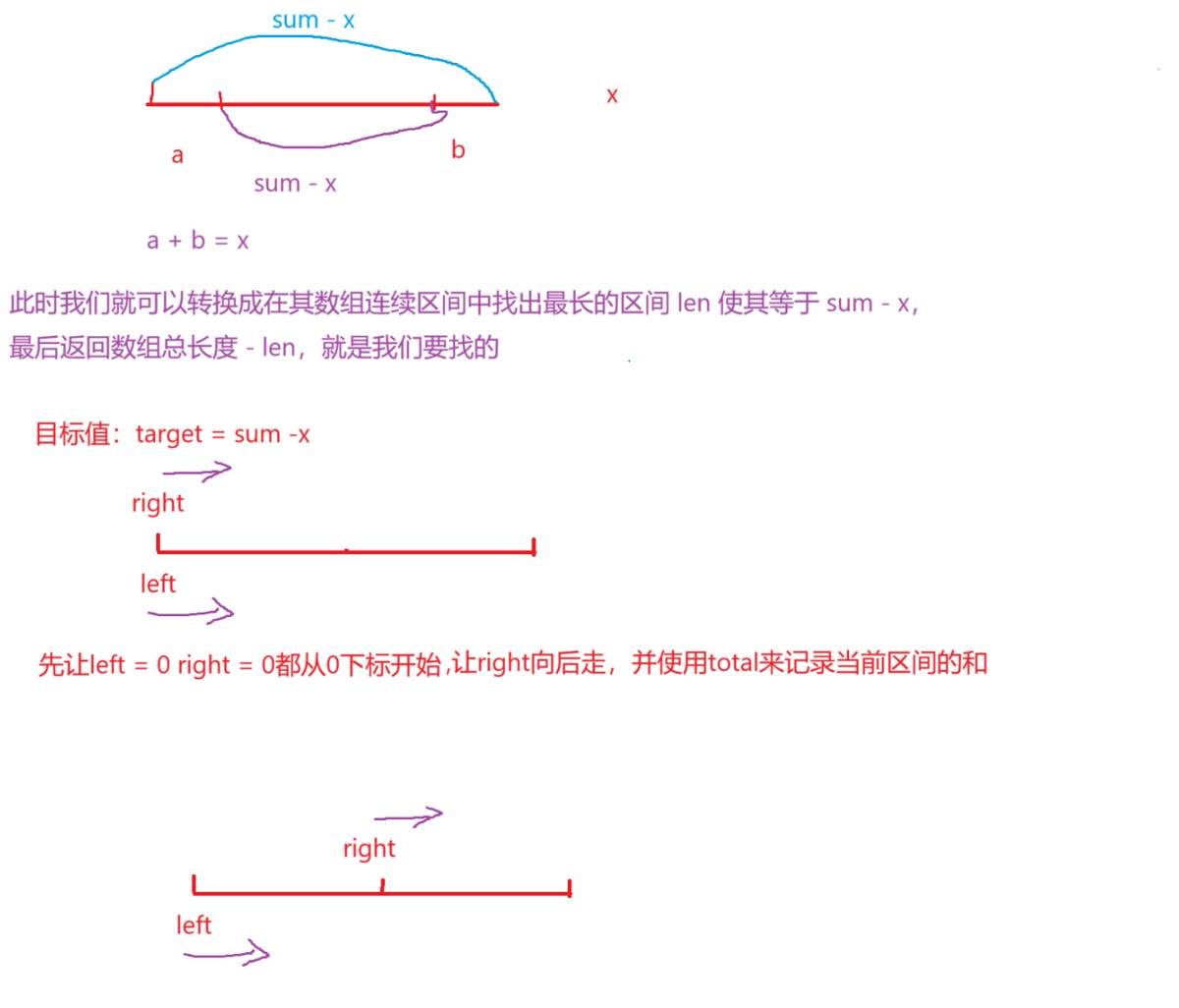 算法原理:首先算出总的数组和sum ,我们的目标值target = sum - x,我们直接从数组中找出一个最长长度区间,使其值等于target