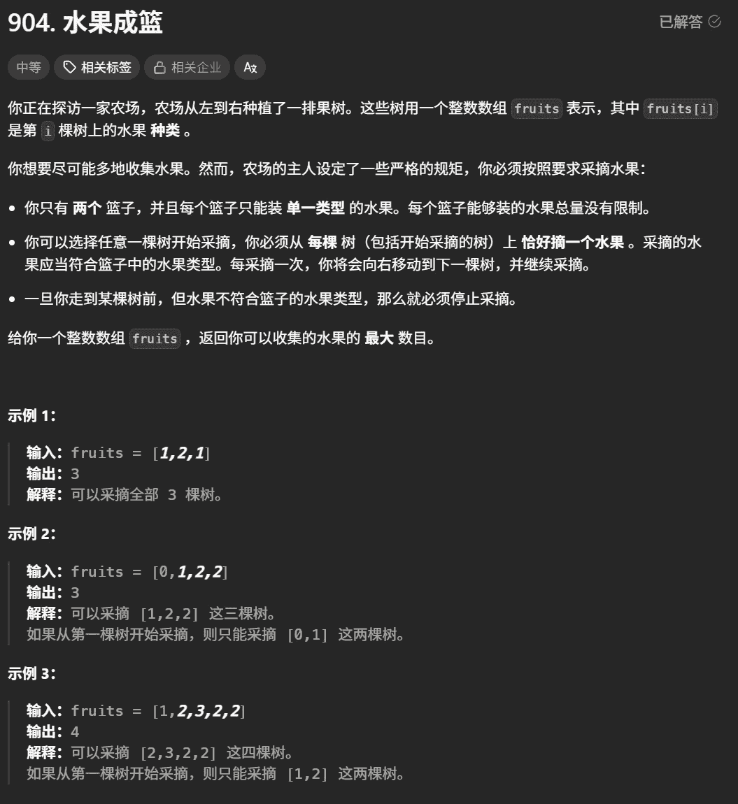 题目解析:就是给我们一个fruits数组,里面又好多种类,让我们用两个篮子放水果,并且每个篮子只能放一种水果,并且不可以跳着摘水果,遇到第三种水果直接停止采摘,获取其中最多摘多少水果