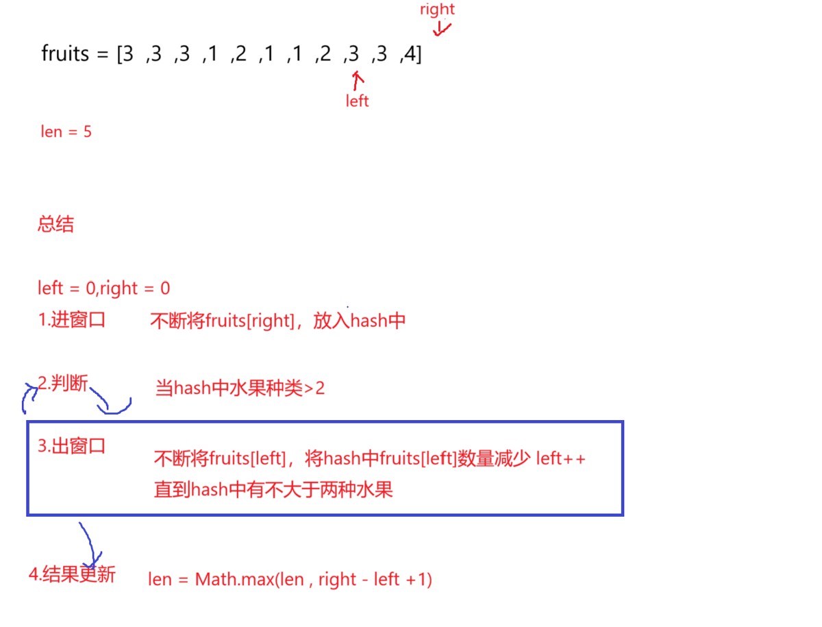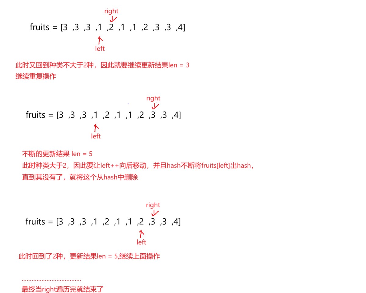 当种类>2的时候就要出窗口left下标对应的水果数量–,当其是0的时候说明其种类减少,将其从hash中删除,left++