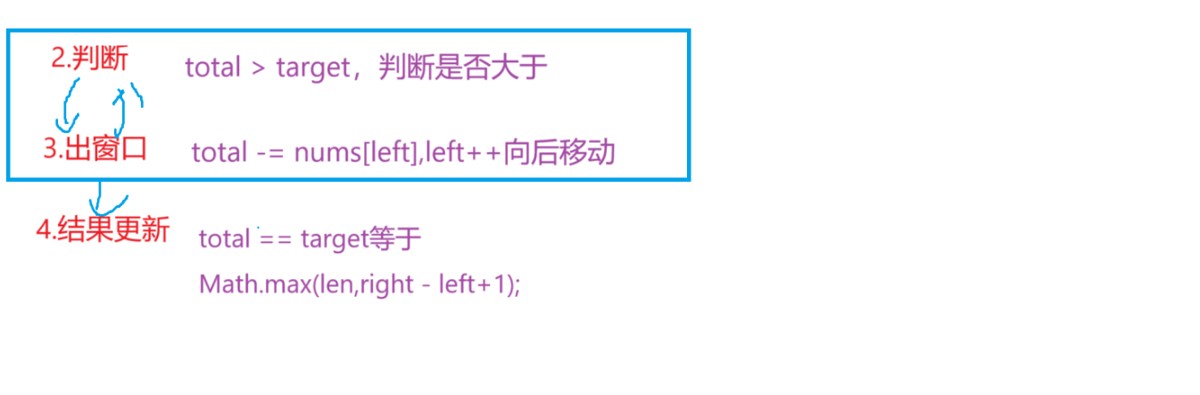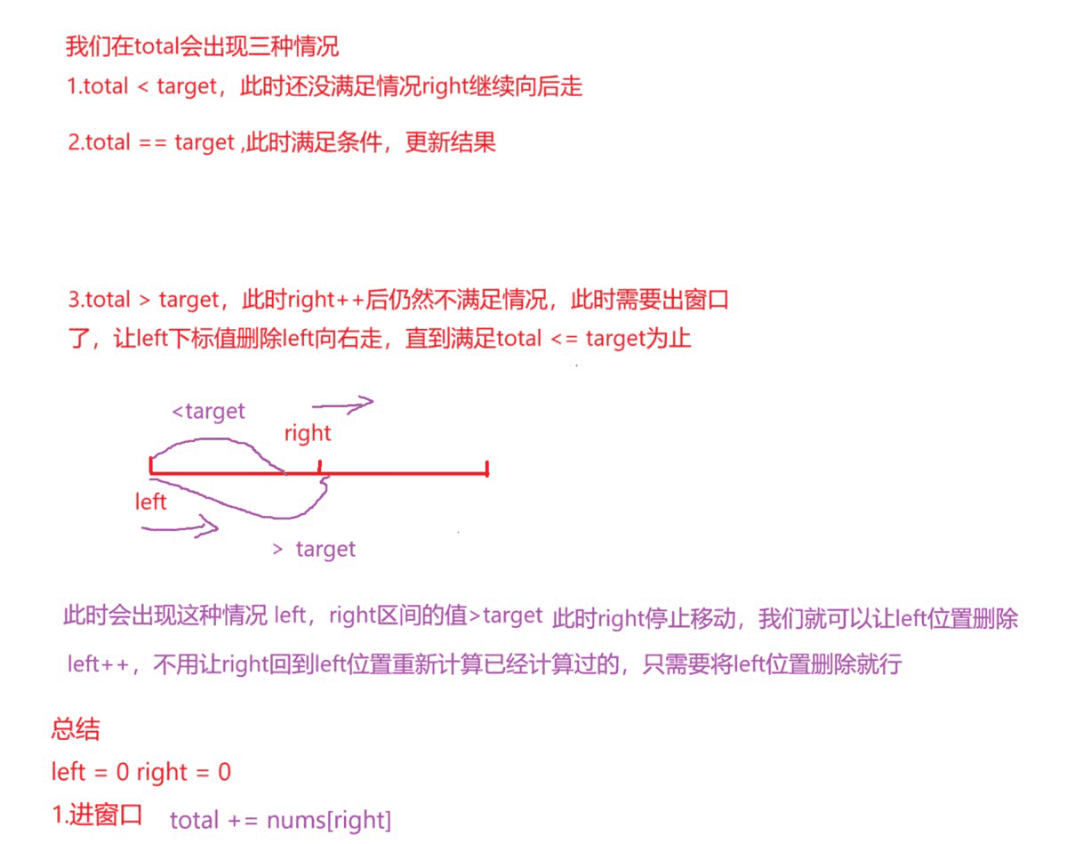 当total > target就出窗口,删除left下标的值,并让left++,直到total <= target为止