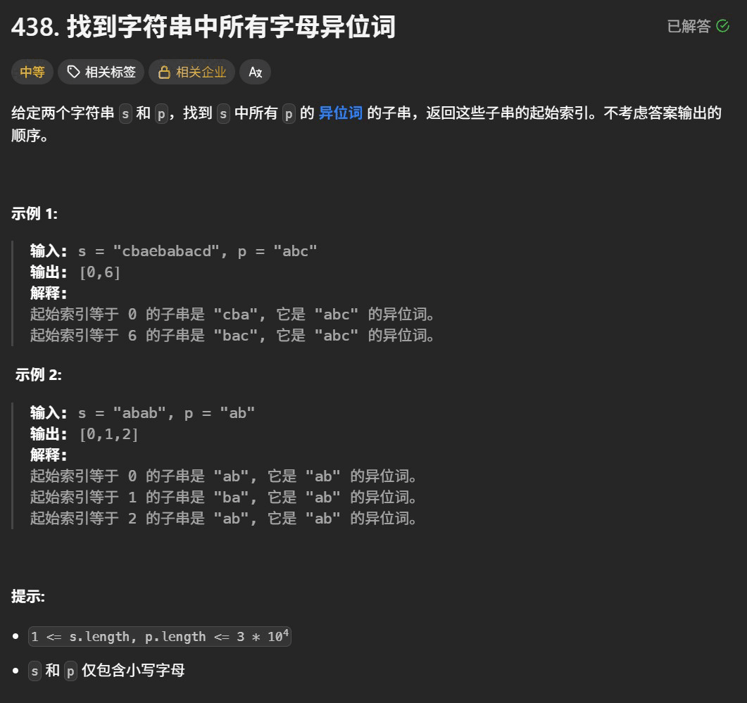 题目解析:就是给我们s和p两个字符串,让我们再s中找到所有p的异位词子串,并将其索引,最后返回其中所有的索引