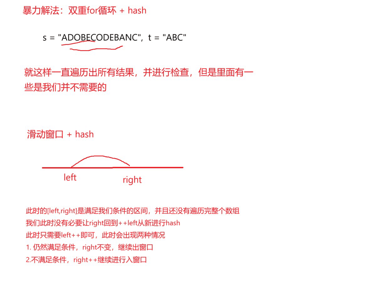 滑动窗口+hash:left = 0 , right = 0;暴力解法中,我们遇到满足情况进行更新结果时候,其实并不需要将其right从新返回left,重新放入hash中,我们只需要将left下标对应字符出去就行,因为此时只会出现两种情况1.还满足条件right不动2.不满足条件 right继续右移