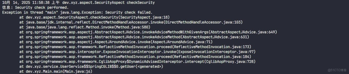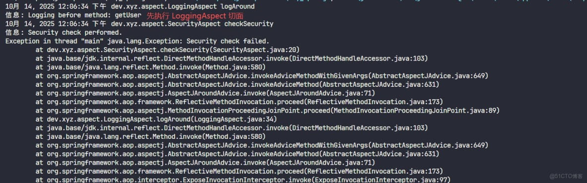 }这里先执行了 SecurityAspect 切面,因为鉴权失败,所以 LoggingAspect 切面不会执行。