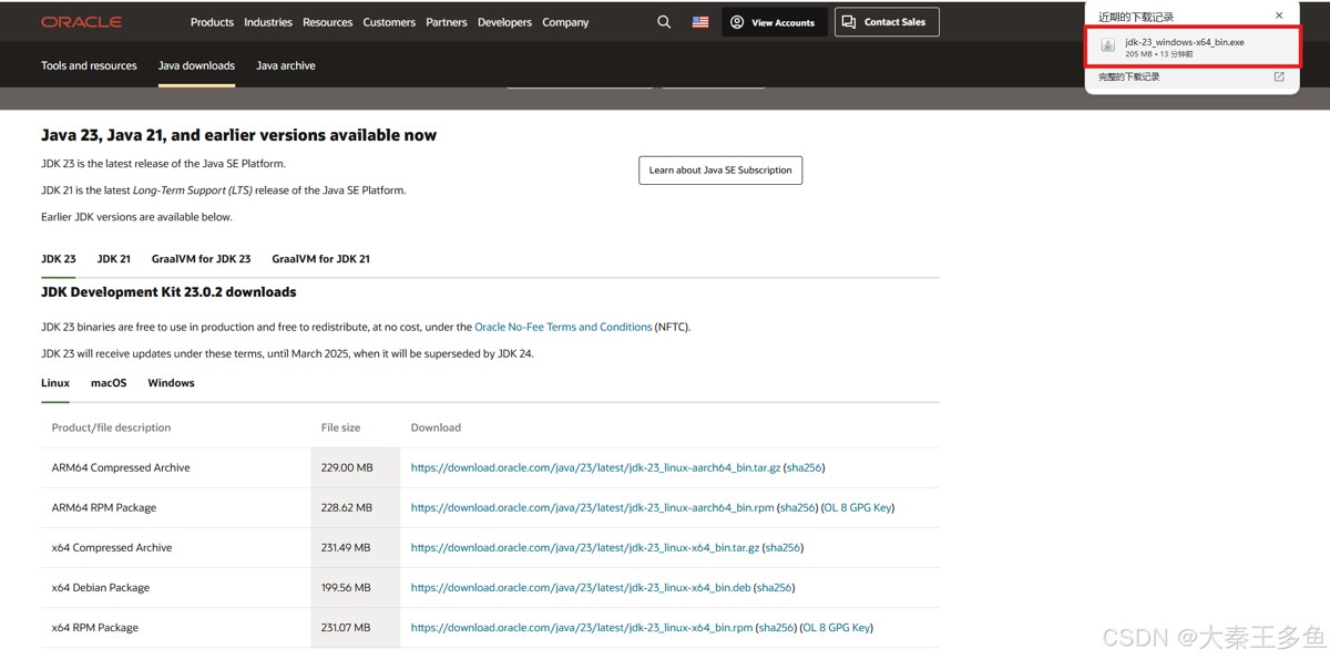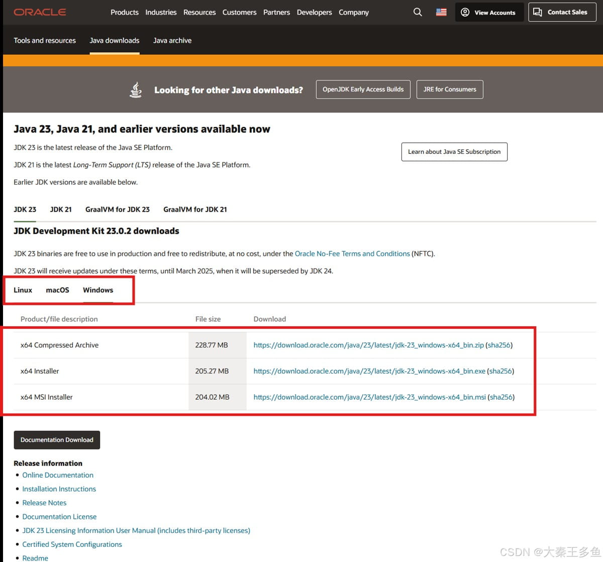 选择适合 JDK 版本,本文选择JDK 23在Windows x64环境下安装 x64 Installer。