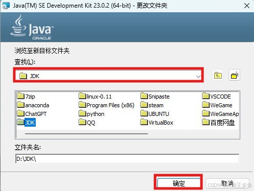 在安装过程中,可以选择默认安装路径,也可以自定义安装路径。我这里改成了自己设置的路径(D:\JDK),记住这个路径,在后面配置环境变量的时候需要用到。