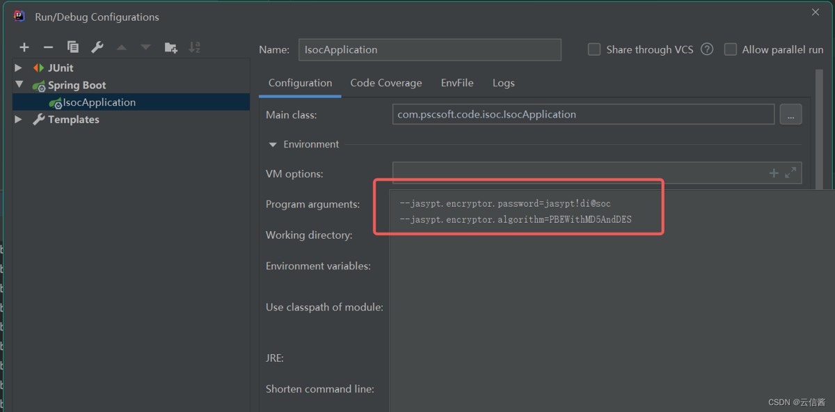 --jasypt.encryptor.password=jasypt!di@soc --jasypt.encryptor.algorithm=PBEWithMD5AndDES
