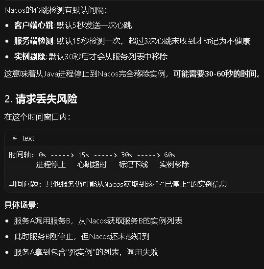 采取主动标记nacos实例下线 + 休眠等待 + 停止java进程方案:先标记nacos实例下线(主动下线而不是被动等待nacos自动检测下线),再设置一个休眠时间一是为了等待nacos更新,二是让正在处理的业务请求有时间完成。最后再停止java进程,避免请求丢失,实现微服务优雅停机。