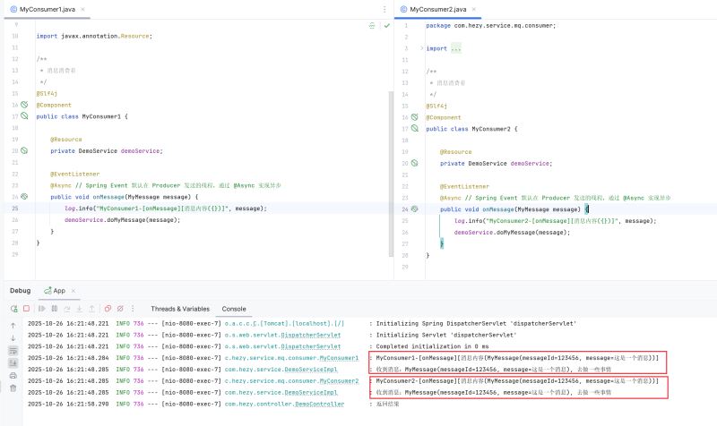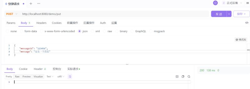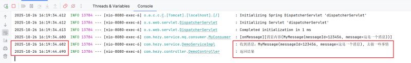 推送消息是异步操作,如下,在推送消息后线程休眠10秒,消息也会在接口返回结果之前被消费。