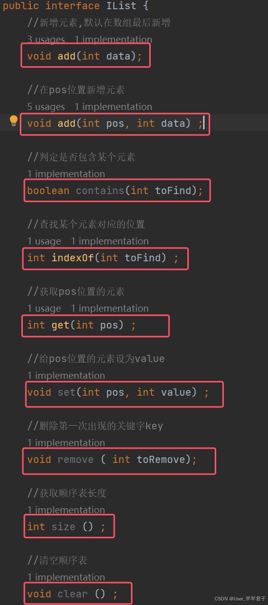 arr: 创建一个整型数组,用来存储数据;usedSize: 有效数据,也就是真实的元素个数;DEFAULT_CAPACITY:默认数组容量MyArrayList():构造方法,初始化数组长度为默认的容量