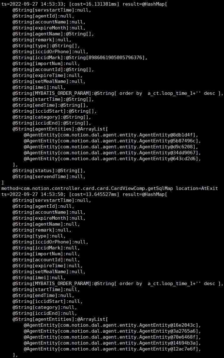 使用jvm神器arthas,watch一下getSqlMap方法,然后分别调用列表查询和导出接口,得到如下两条记录