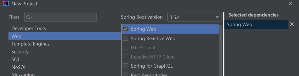 在左侧选择Web,勾选Spring Web(这是创建 Web 项目的核心依赖),如需其他功能,可根据需要选择(如SQL下的Spring Data JPA和MySQL Driver用于数据库操作)