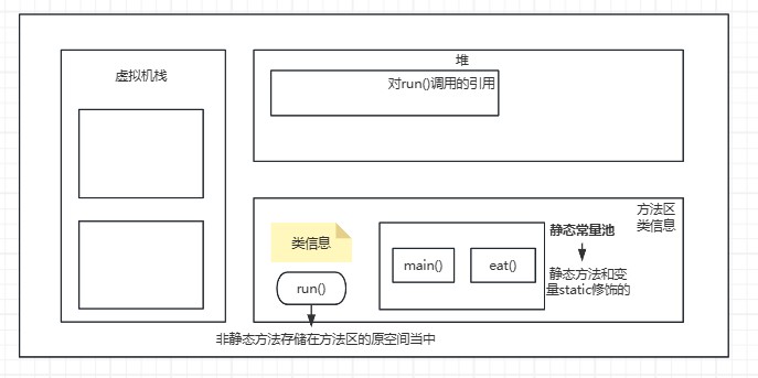 - 非静态方法:也存储在方法区,但属于 “对象可调用” 的成员(需通过对象触发)。