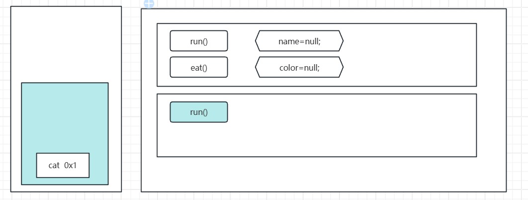 - 左侧 “cat 0x1” 代表子类 Cat 的对象(0x1 是对象在内存中的标识)。