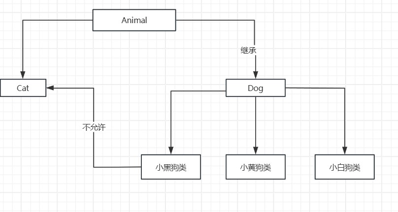 Animal是顶层父类,Cat和Dog都直接继承自Animal(体现 “一个父类可以有多个子类”)。Dog作为父类,又有小黑狗类、小黄狗类、小白狗类三个子类。- 图中 “不允许” 的箭头表示: