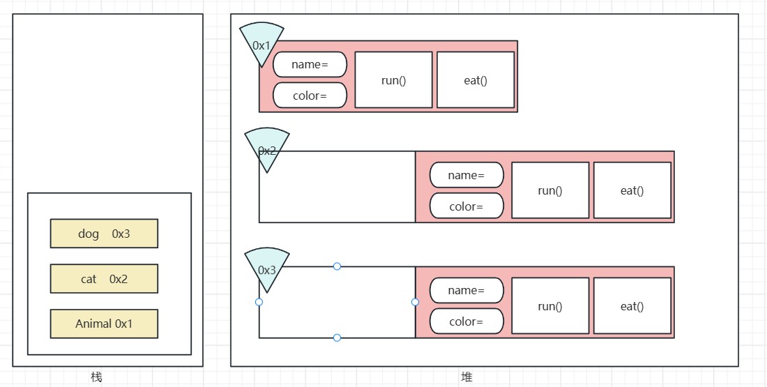 Cat或Dog)时,会先创建父类Animal的对象(堆中0x1标识的区域,包含父类的name、color、run()、eat()),再基于父类对象创建子类对象(如cat 0x2对应的堆区域,继承父类的结构后,还会添加子类自身的特性)。