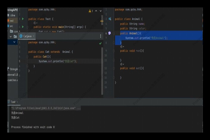 Animal:包含构造方法public Animal(){ System.out.println("我是Animal"); },当父类对象被创建时,该构造方法会执行,打印 “我是 Animal”。 - 子类
