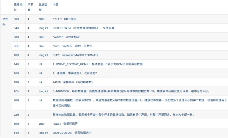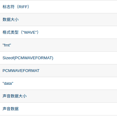 +------------------+------------------+-----------------+ | ChunkID "RIFF" | ChunkSize | Format "WAVE" | +------------------+------------------+-----------------+ | Subchunk1ID "fmt "| Subchunk1Size | AudioFormat ... | +------------------------------------------------------+ | Subchunk2ID "data"| Subchunk2Size | 音频数据 | +------------------------------------------------------+