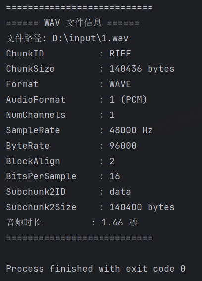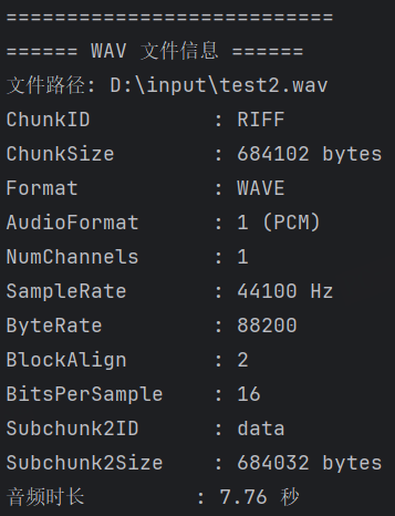假设有一个单声道 16bit、采样率 44100Hz 的 WAV 文件 11.wav,打印结果类似: