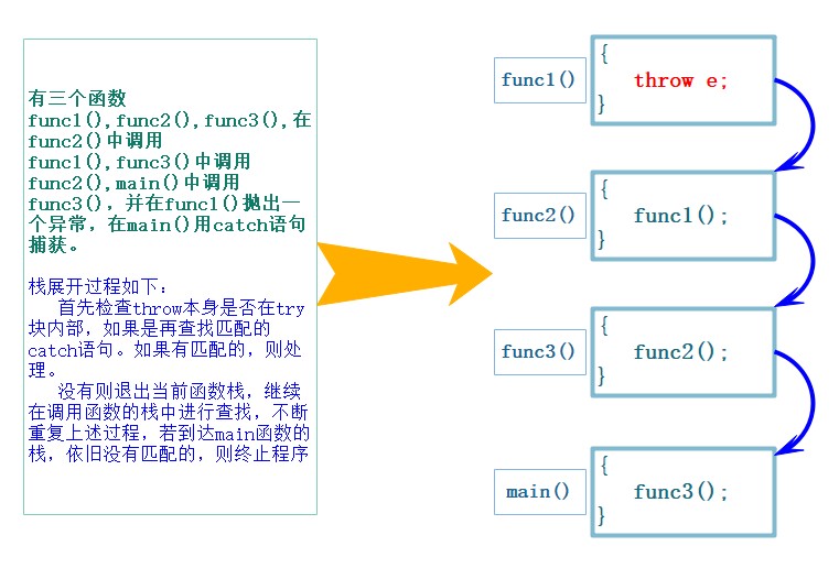 如果当前函数中没有try/catch子句,或者有try/catch子句但是类型不匹配,则退出当前函数,继续 在外层调用函数链中查找,上述查找的catch过程被称为栈展开。