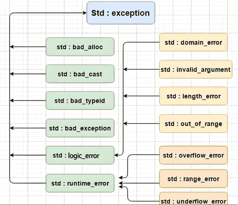 C++标准库也定义了一套自己的异常继承体系,库基类是exception,所以我们日常写程序,需要在主函数捕获exception即可.要获取异常信息,调用what函数,what是一个虚函数,派生类可以重写。