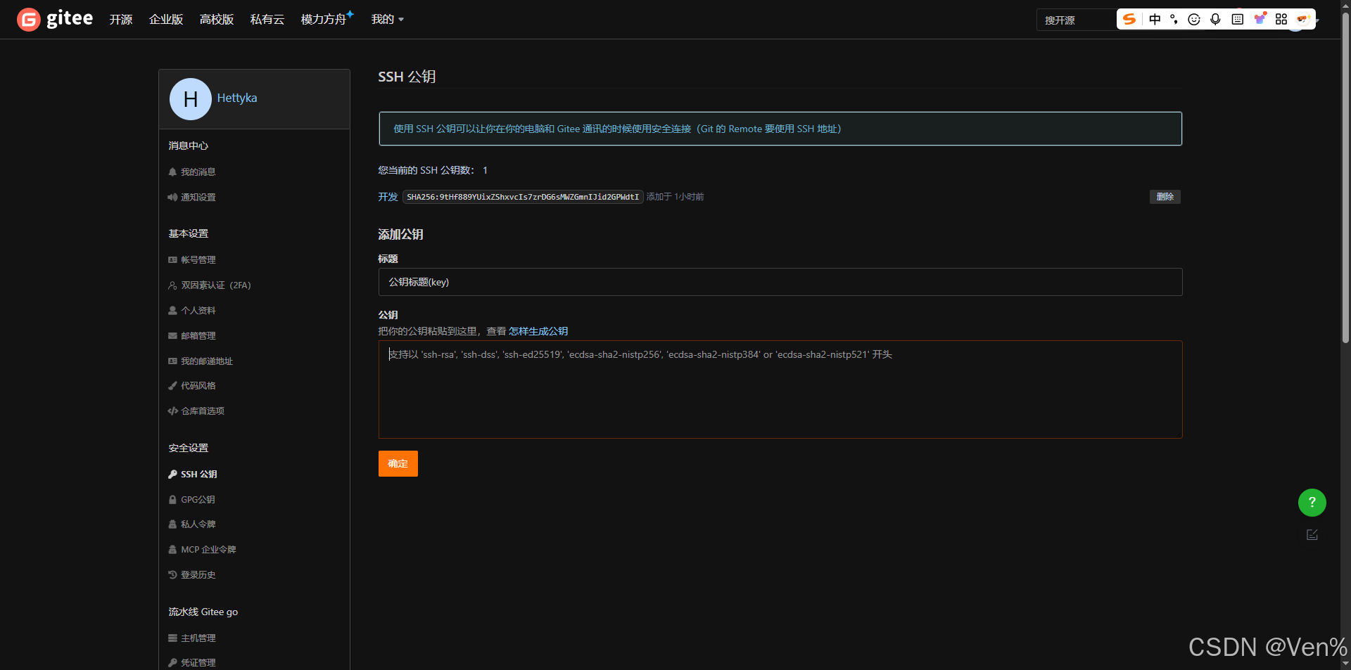- 登录 Gitee,进入「设置」→「SSH 公钥」