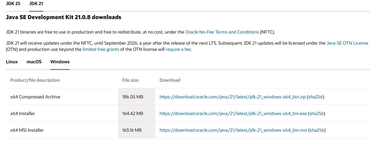 进入官网后会看到许多版本的jdk,在上一篇中提到,Java中有LTS版本(长期支持版本),现在有四个版本的长期支持版本Java8,Java11,Java17,Java21,咱们下载Java21版本,